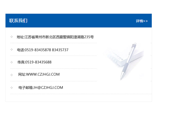 地址:常州市新北區友邦商務大廈1幢16、17層  電話:0519-85101652  傳真:0519-85112595  郵編:213022  網址:www_cz-jiayue_cn.jianwen88.com  郵箱:xiajifengaa@163.com